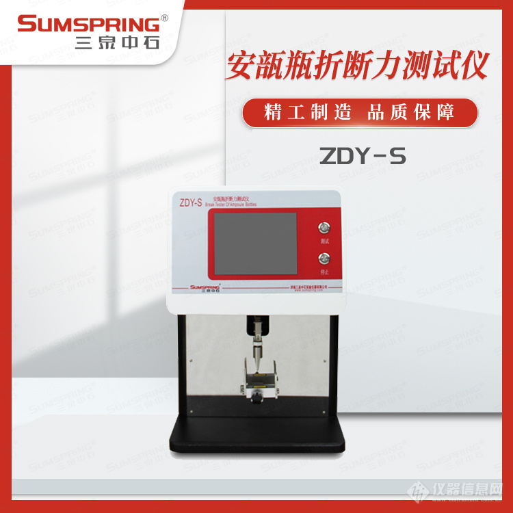 检测仪器:三泉中石的ZDY-S安瓿瓶折断力测试仪通过特殊夹具将瓶颈与瓶身分离,实时记录力值与位移变化,精确输出折断力数据。